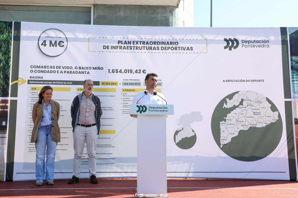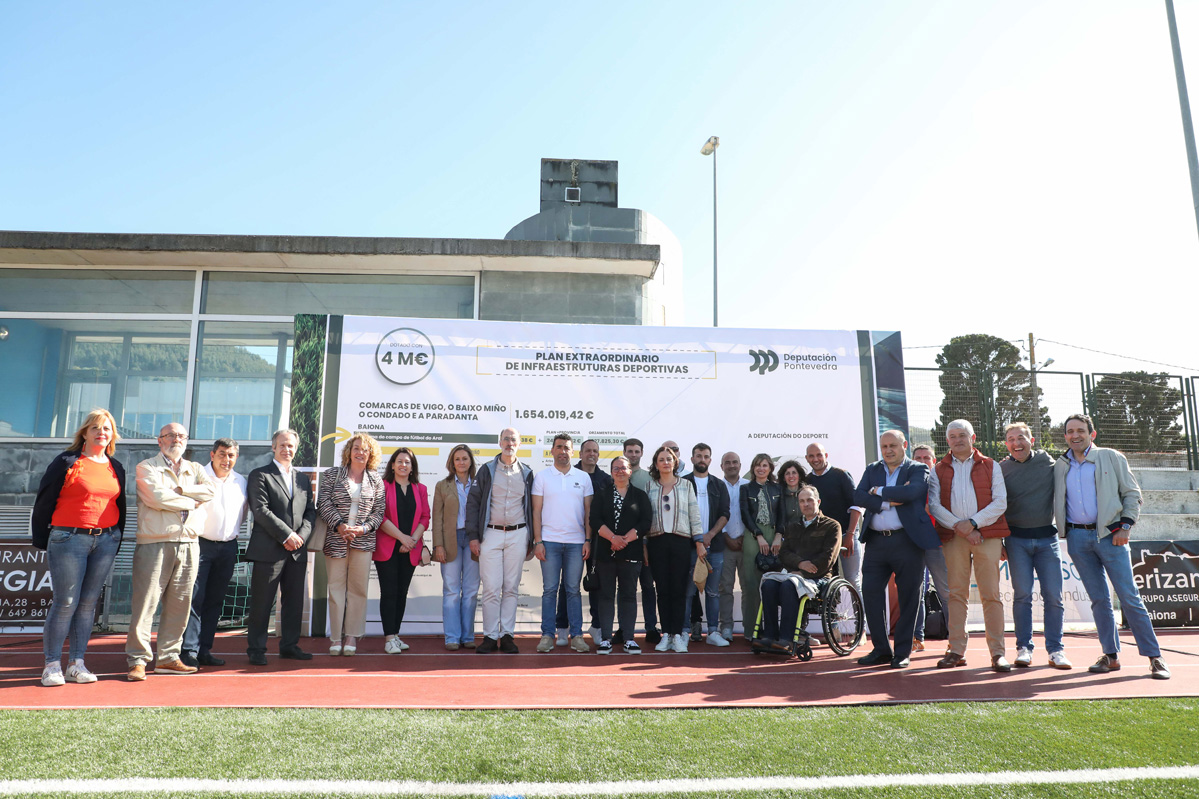 O acto, ao que asistiron alcaldes e concelleiros de todos os concellos destas catro comarcas, tivo lugar no campo de fútbol de Aral, en Baiona. Un recinto que será obxecto dunha profunda remodelación, que será financiada ao 100 % con recursos da Deputación de Pontevedra, que achega 81.200 euros a través de dito plan; e 246.590 euros procedentes dunha subvención concedida ao Concello de Baiona ao abeiro da Liña 1 de Investimentos do +Provincia. Unha obra que suporá un investimento de 330.000 euros e que é “froito da colaboración leal o Concello a Deputación”, subliñou Luis López.