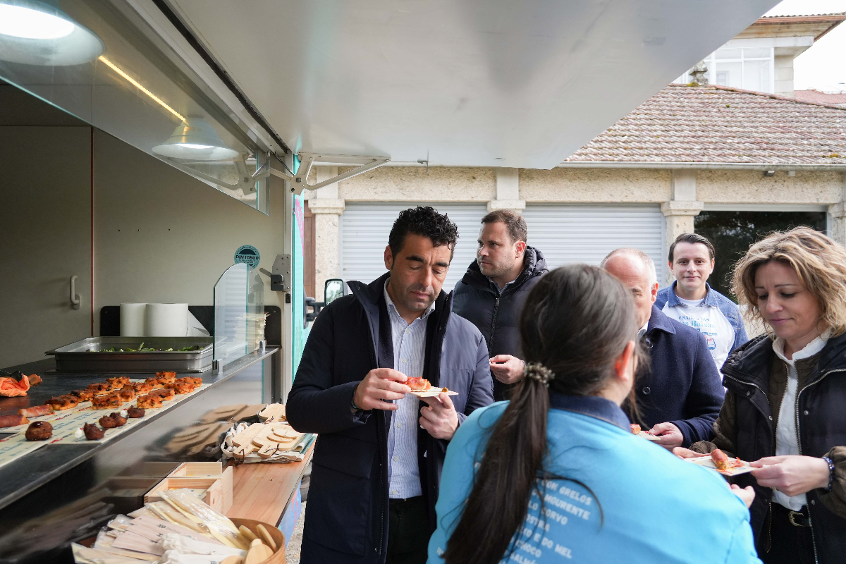 O presidente da Deputación de Pontevedra, Luis López, achegouse este venres á praza da Constitución de Cuntis para degustar os pratos inspirados nas festas gastronómicas da provincia que desde esta fin de semana comezan a ofrecer tres food trucks que percorrerán os 61 concellos da provincia ao abeiro do programa provincial “O Sabor das Rías Baixas”. Acompañado polos deputados Jorge Cubela e Javier Tourís, o mandatario provincial tivo a oportunidade de degustar estas preparacións e comprobar a boa acollida dun proxecto estreado esta fin de semana e que supón “un paso adiante” na estratexia de diversificación da oferta turística e impulso a un dos atractivos das Rías Baixas como é a gastronomía.