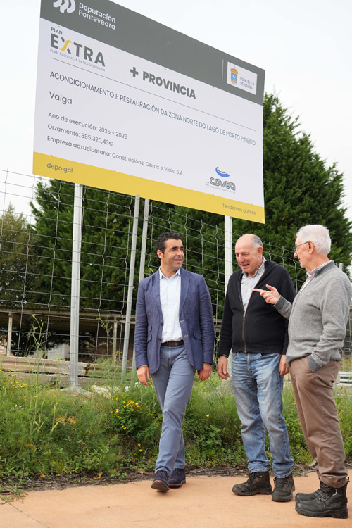 O presidente da Deputación de Pontevedra, Luis López, visitou este venres a Lagoa de Porto Piñeiro, no Concello de Valga, para comprobar o inicio dunha nova fase das obras de renaturalización e mellora deste enclave no que a Deputación colabora co goberno local cun investimento de máis de 1,42 millóns de euros a través de programas de cooperación como o PON2030, o Plan + Provincia ou o Plan Extra. Acompañado polo alcalde José María Bello Maneiro, o mandatario provincial percorreu un treito deste espazo no que se transformará un terraplén nun sistema de terrazas accesibles co obxectivo de abrir un novo acceso seguro ata a lagoa e garantir a seguridade ao reducir os riscos de desprendementos. "Esta actuación vai a converter a Lagoa de Porto Piñeiro nun referente desde o punto de vista medioambiental e social. É un proxecto estratéxico para Valga e para a provincia, por proxectos deste calado o foco internacional ten posto os seus ollos no interior da provincia", salientou o presidente.