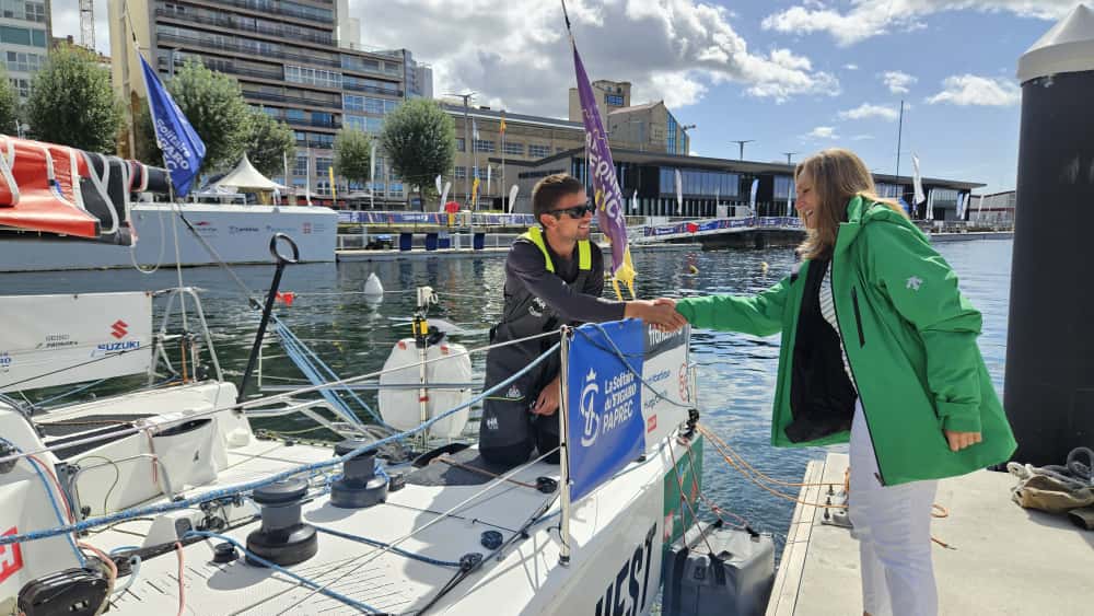 Luisa Sánchez coroa a Hugo Cardon como gañador da segunda etapa de La Solitaire du Figaro no porto de Vigo