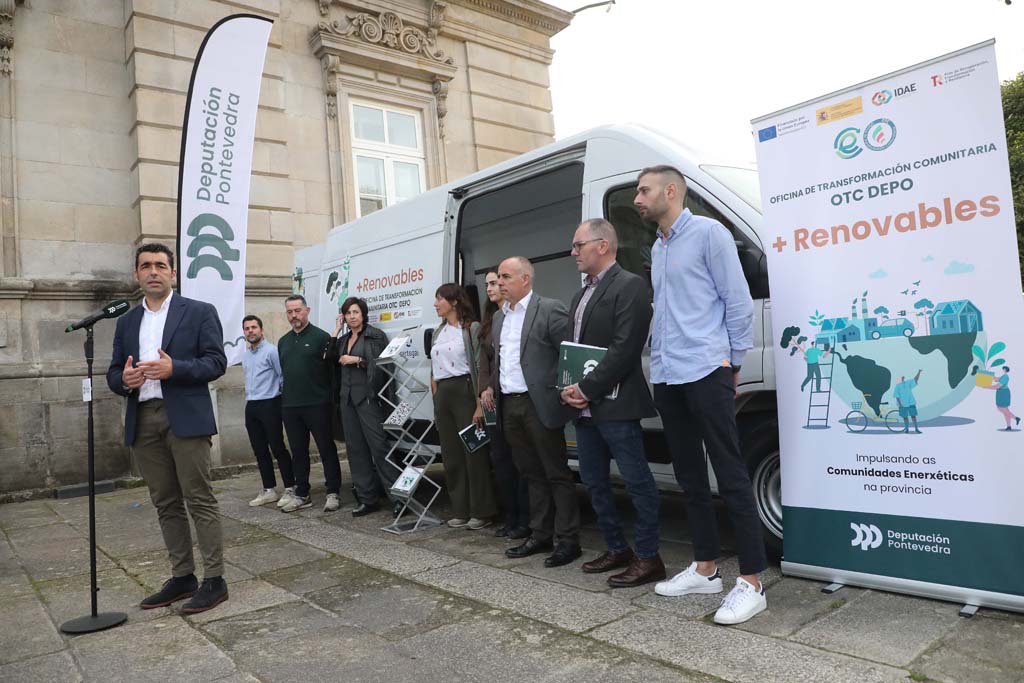 “Hai seis meses estabamos en Barro abrindo a Oficina de Transformación Comunitaria, co obxectivo de mudar a maneira de consumir e producir enerxía. Nese tempo, xa demos pasos visitando concellos e percibimos que vai ser un éxito e que os proxectos vanse multiplicar. Nesta oficina móbil, 100% eléctrica, imos informar á veciñanza sobre que son as comunidades enerxéticas, cales son os seus beneficios e como se poñen en marcha. E imos acompañar aos interesados en todo o proceso ata completar a súa posta en funcionamento. É un proxecto que reflicte á perfección o espírito desta Deputación: o compromiso co municipalismo, as comunidades enerxéticas van chegar a toda a veciñanza viva onde viva”, explicou o mandatario provincial nas escalinatas do Pazo provincial, nun acto no que estivo presente o deputado de Acción Comunitaria, Javier Tourís; persoal da OTC e de Sertogal, a empresa que xestiona a oficina móbil.