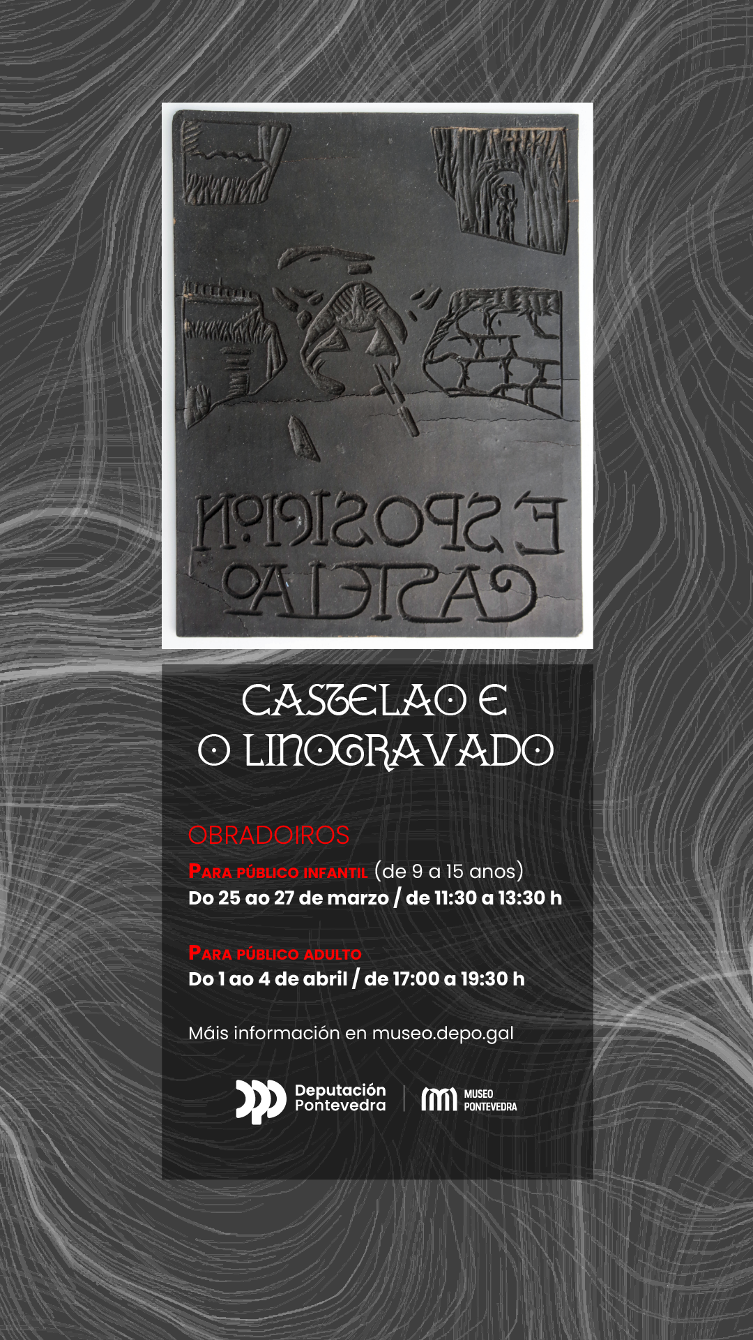O Museo de Pontevedra organiza dous obradoiros co título Castelao e o Linogravado, nos que as persoas participantes se introducirán nesta técnica de estampación. O primeiro obradoiro está dirixido a nenas e nenos de 9 a 15 anos e desenvolverase durante as mañás do luns, martes e mércores de Semana Santa (25, 26 e 27 de marzo, de 11:30 a 13:30 horas). Haberá 15 prazas dispoñibles, que se adxudicarán por rigorosa orde de inscrición. Para apuntarse hai que escribir a reservas.museo@depo.gal a partir deste martes 5 de marzo ás 9:00 h, indicar o nome e a idade da nena ou do neno e incluír un número de teléfono de contacto.