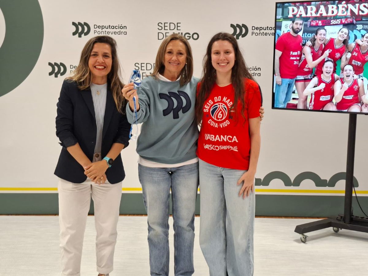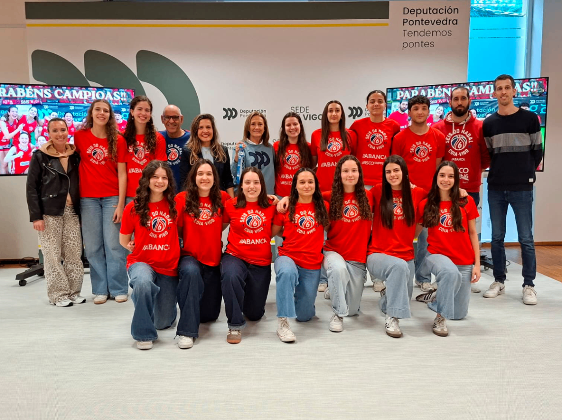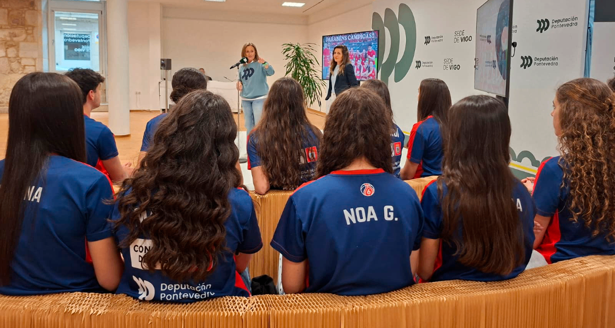 A vicepresidenta da Deputación de Pontevedra recibiu este martes na sede de Vigo ao equipo feminino júnior do Club Baloncesto Seis do Nadal, que vén de proclamarse campión galego. A tamén deputada de Deportes puxo en valor o traballo, a constancia e o bo ambiente que hai detrás deste éxito. Igualmente, destacou a importancia de contar con referentes no deporte feminino e de apoiar o deporte base, sinalando que clubs como o Seis do Nadal son un exemplo para a mocidade da provincia. Tras entregarlles uns obsequios cortesía da Deputación de Pontevedra, Luisa Sánchez trasladoulles os seus parabéns e animounas a seguir gozando do deporte. As xogadoras e o corpo técnico entregaron á vicepresidenta unha medalla conmemorativa do seu campionato.