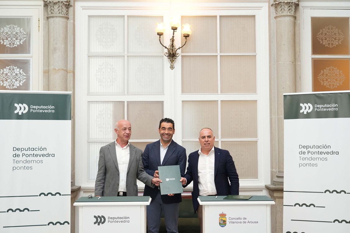 O presidente da Deputación de Pontevedra, Luis López, acaba de asinar o convenio de colaboración co alcalde de Vilanova de Arousa, Gonzalo Durán, para a mellora da área deportiva do Talaso de Terrón a través da construción dun edificio que funcionará como centro de Talasoterapia. Un acordo asinado no marco do Plan Extra, o novidoso plan de investimentos do goberno provincial que mobiliza ata 38 millóns de euros entre os concellos de menos de 50.000 habitantes da provincia para executar proxectos estratéxicos. No Pazo provincial, López e Durán selaron un acordo a través do cal o organismo provincial achega 900.000 euros para financiar unha obra valorada en máis de 1,8 millóns de euros. Segundo sinalou o mandatario provincial, que estivo acompañado polo deputado e concelleiro, Javier Tourís, este apoio ademais de mellorar os servizos prestados á veciñanza de Vilanova de Arousa, tamén contribúe "a desestacionalizar e a fomentar un turismo de calidade no conxunto da provincia de Pontevedra".