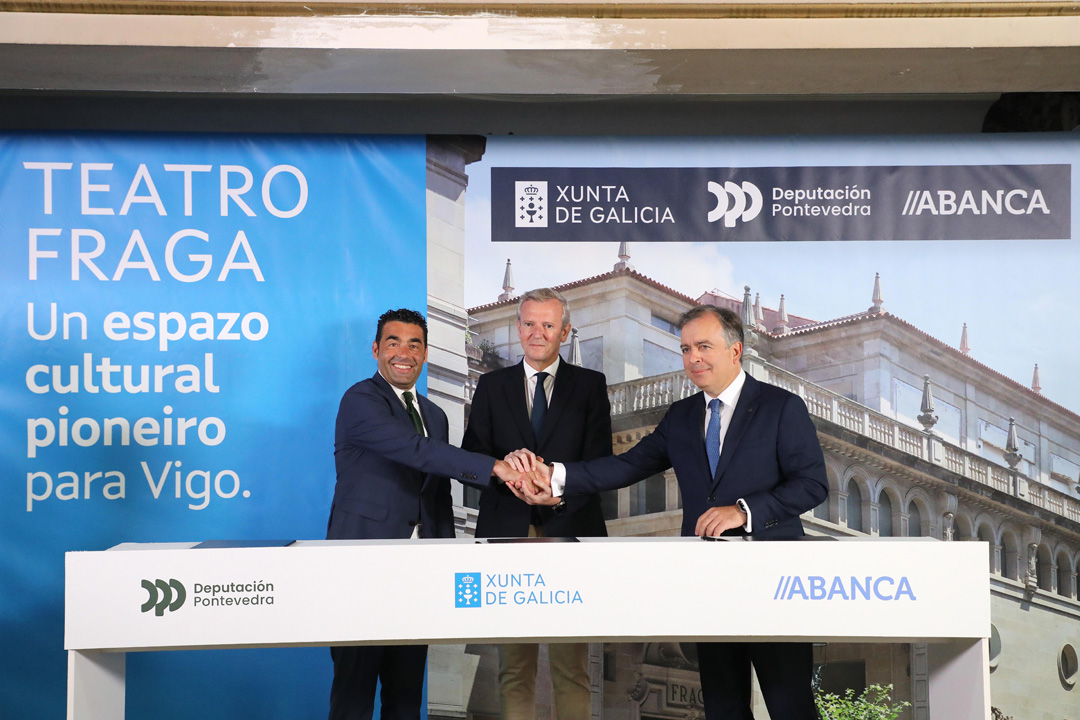 O presidente da Deputación de Pontevedra, Luis López, destacou o impulso para o sector cultural e a cidade de Vigo que suporá a recuperación do Cine Fraga durante a sinatura do acordo para a compra do inmoble por parte da Xunta de Galicia e a institución provincial a Abanca, propietaria do edificio, por un total de 9,3 millóns, dos que a Deputación asumirá o 49 %. Un acordo que supón un compromiso cumprido coa cidade de Vigo ao devolverlle á cultura un dos seus emblemas. "Durante moito tempo falamos do Cine Fraga como un pasado cada vez máis remoto ou como un pasado interrompido polo que puido ser e non foi. Por iso hoxe é un día tan sumamente importante: volvemos a falar do Fraga en presente e en futuro", afirmou o presidente Luis López, que participou neste protocolario acto xunto co presidente da Xunta de Galicia, Alfonso Rueda; e o conselleiro delegado de Abanca, Francisco Botas.
