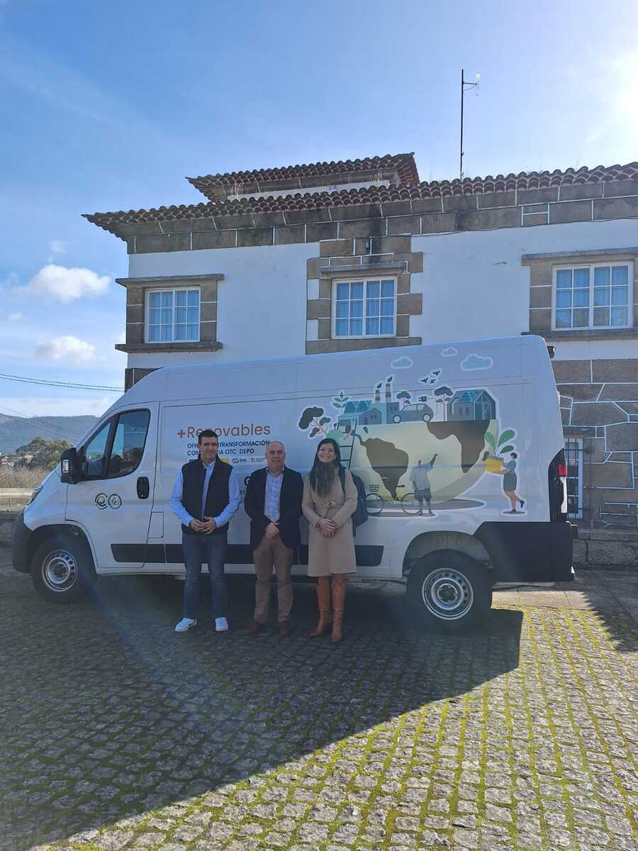 O deputado de Acción Comunitaria, Equipamentos Públicos e Finca Areeiro da Deputación de Pontevedra, Javier Tourís, visitou este xoves os concellos da Mos e O Porriño coa oficina móbil do programa +Renovables, coa que a Deputación está a descentralizar os servizos que se prestan desde a Oficina de Transformación Comunitaria (emprazada no Viveiro de Empresas de Barro) para implicar os pequenos concellos nos retos da sostibilidade. O deputado provincial visitou a instalación móbil xunto coa alcaldesa de Mos, Nidia Arévalo, e o alcalde do Porriño, Alejandro Lorenzo.