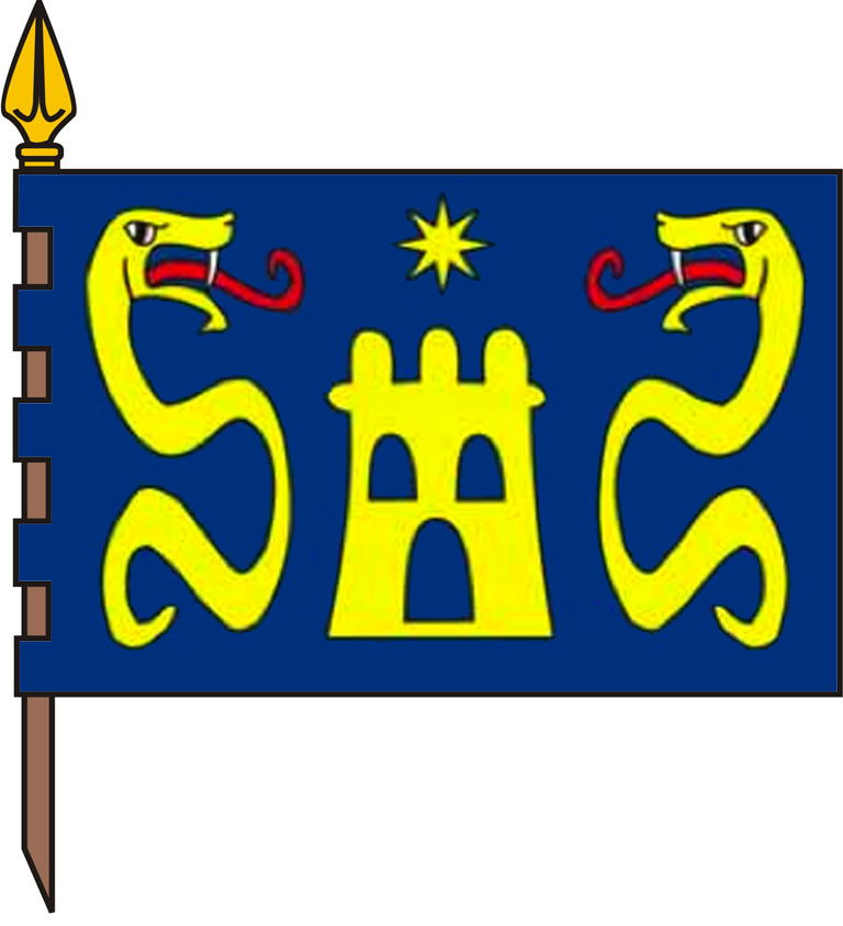 Sobre pano de azur, a torre e estrela de amarelo, flanqueadas das serpes enfrontadas do mesmo e linguadas de vermello.