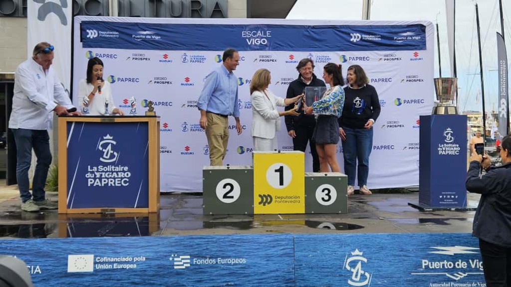 A cerimonia de entrega de premios -na que tamén participaron o presidente da Autoridade Portuaria de Vigo, Carlos Botana, e o director xeral para o Deporte, José Ramón Lete- serviu para recoñecer igualmente o segundo posto do galo Alexis Loison, que mantén o liderado provisional na clasificación xeral, e a terceira praza da tamén francesa Charlotte Yvel. A última etapa partirá ás 17.00 horas deste domingo desde o porto olívico, onde permanece amarrada a frota que participa nesta regata oceánica, composta por 34 monotipos.