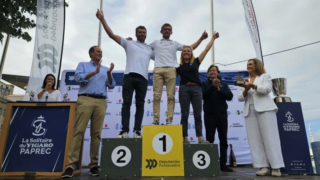 Luisa Sánchez coroa a Hugo Cardon como gañador da segunda etapa de La Solitaire du Figaro no porto de Vigo