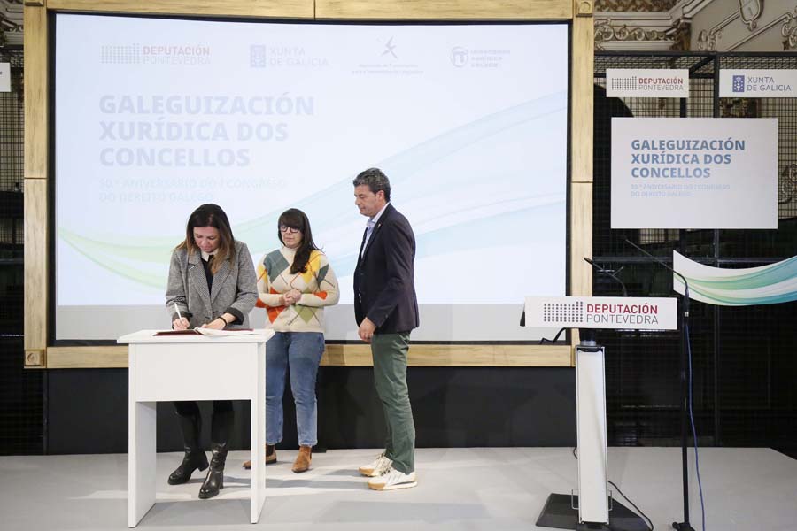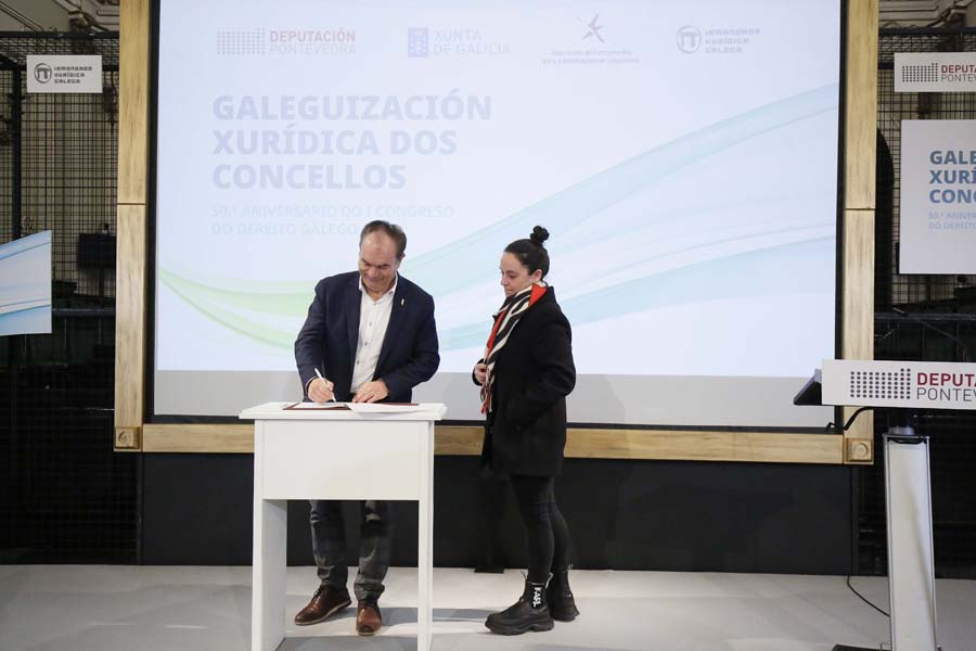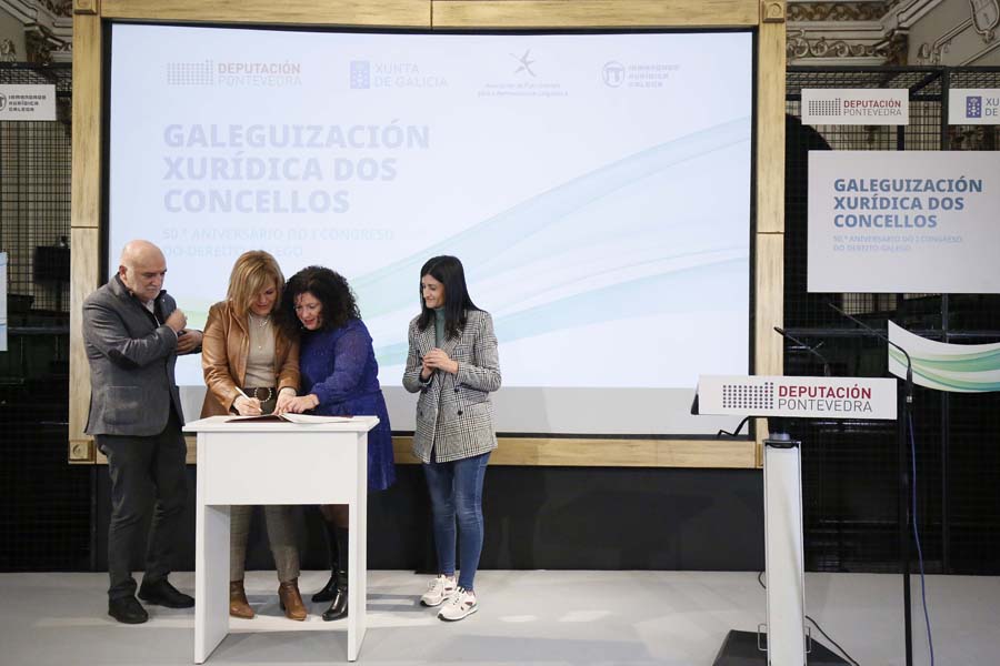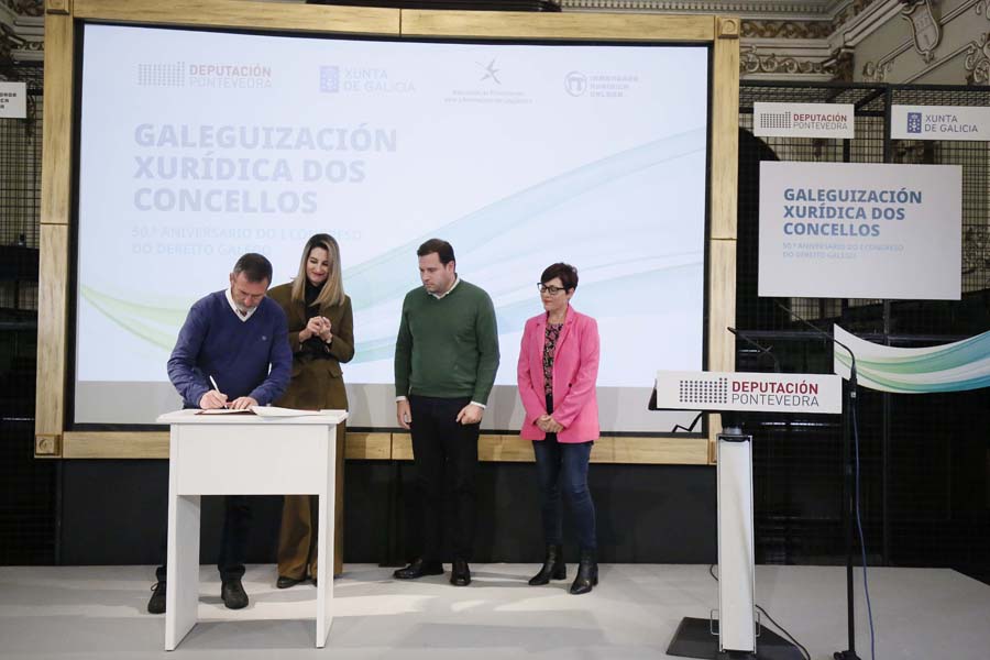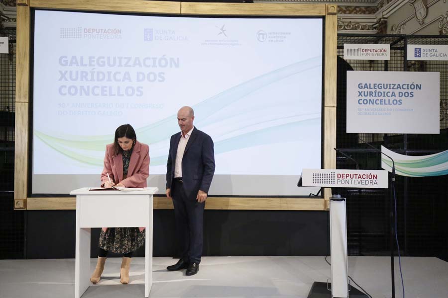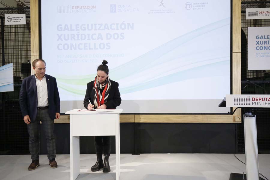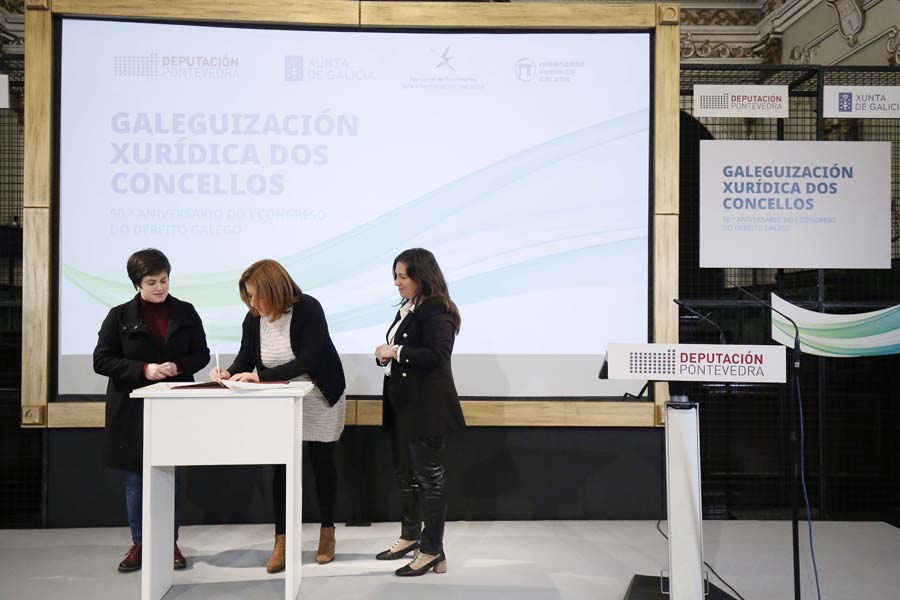 A Deputación de Pontevedra, a Irmandade Xurídica Galega e a Xunta de Galicia, xunto a 35 pequenos concellos da provincia, asinaron hoxe a ‘Declaración de Pontevedra’, un manifesto no que se comprometeron a fomentar o uso do galego nas relacións entre as corporacións locais e a xustiza. Segundo subliñaron a presidenta Carmela Silva e a deputada de Lingua María Ortega, este compromiso supón “un feito histórico” na normalización do idioma do país, xa que nestes momentos a lingua galega fica aínda relegada no uso xudicial por cuestións históricas.