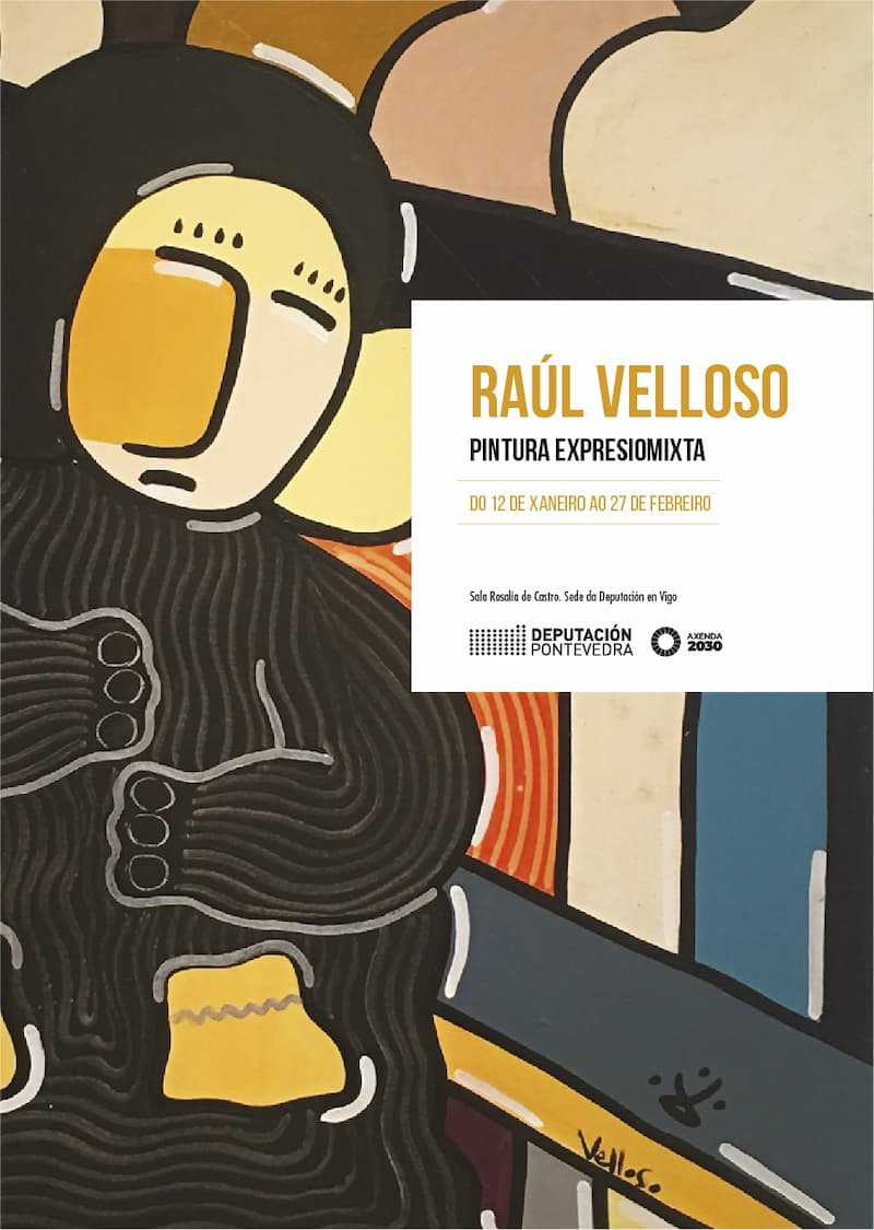 Pintar es crear: dar color, decorar y transitar una búsqueda del equilibrio en mi paleta de colores. Es también luchar por conseguir un espacio más armonioso y romper con las desigualdades. Como artista me gusta representar a la mujer, pero siempre lejos de los estereotipos a los que nos tiene acostumbrados la historia del arte, donde se representaba idealizándola, objetualizándola, ensalzando su físico y relegándola a roles particulares secundarios. Yo quiero reflejarla tal y como la veo: fuerte, poderosa, inteligente, resolutiva e igual de capaz, ni menos ni más, que ningún hombre. Me inspiro en la mujer gallega, esa mujer del mar y del campo que ha sacado adelante a la familia sin ver reconocido su labor profesional y su papel esencial en la unidad familiar. Con esta exposición quiero reivindicar el papel de la mujer gallega, más allá de la mujer en el mundo, e involucrarme, un poco más, en la lucha que también los hombres debemos llevar a cabo a su lado, para mentalizar a la sociedad de que un mundo en igualdad será un mundo más justo para todas y todos. Agradezco, así, a la Diputación de Pontevedra, a través de mi trabajo artístico, la posibilidad de llenar esta sala de color, en un canto a la justicia y la igualdad de oportunidades. Raúl Velloso