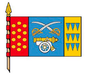 De azul (azur) el cañón de oro (amarillo), con el carro y ruedas de plata, surmontado por dos sables de caballería de plata (blanco), guarnecido de oro y dispuesto en aspa. Al timbre, corona real cerrada.