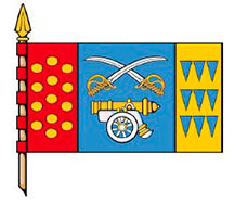 El paño azul y el cañón amarillo, con su corona y las ruedas blancas, y encima dos sables de caballería blancos, guarnecidos de amarillo y dispuestos en aspa. Terciada de rojo, en el asta, con los trece besantes amarillos (Sarmiento), y de amarillo, en el batiente, con las cuñas azules (Acuña).